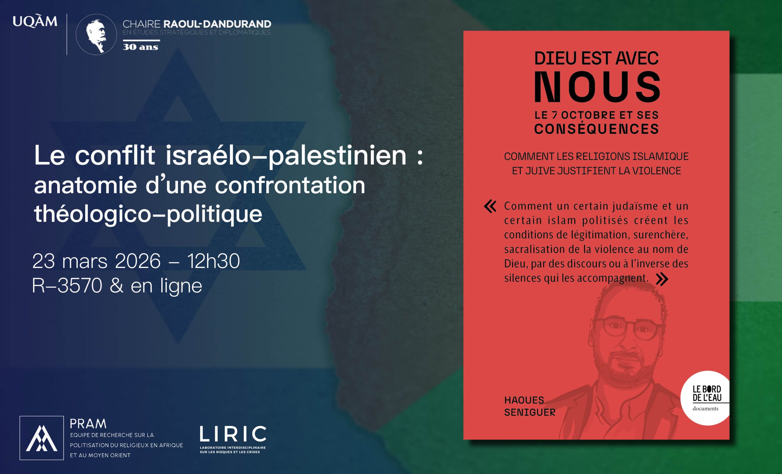 L'Observatoire sur le Moyen-Orient et l'Afrique du Nord organise une conférence avec Haoues Seniguer. Outre l’examen des ressorts et mobiles religieux, politiques et géopolitiques des attaques terroristes du 7 octobre, son intervention vise à reconstituer les « raisons d’agir » des acteurs impliqués. Il s’agira ainsi d’exposer et d’expliciter, dans une perspective wébérienne et néo-wébérienne, la manière dont les principaux belligérants israéliens et palestiniens, ainsi que leurs soutiens dans le monde arabe et en France, mobilisent les référentiels judaïque et islamique pour justifier la violence. L’analyse s’appuie sur un corpus de textes, documents et déclarations sélectionnés, émanant de l’Hexagone, d’Israël, de la Palestine et du monde arabe. La discussion sera animée par le professeur Adib Bencherif et Walid Ferguen.